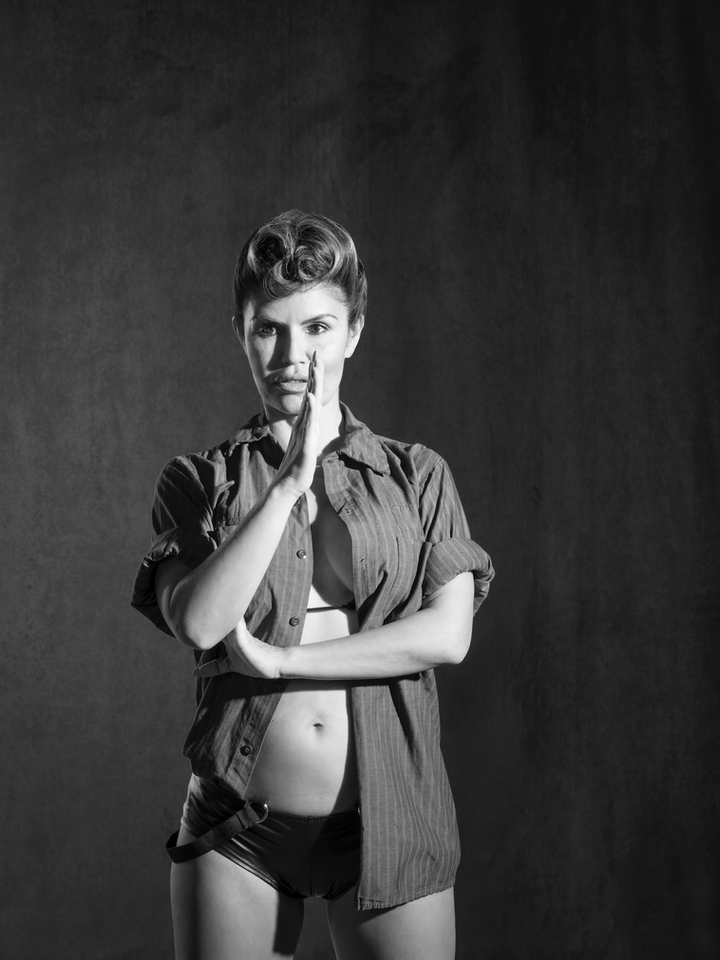 Dazza del Rio came to fame in the late 80s and the 90s as lowrider magazine’s most popular cover girl. She is an icon. Dazza is comfortable in her own skin. Playfully defiant, she refuses to accept the idea that embracing and putting her sexualized identity at the forefront is necessarily oppressive. She is an agent, and the word victim is not part of her vocabulary.For the BODY MAGIC photographs, Dazza del Rio and I, as twins, attempt to embody Lisa Lyon as she performs in the Mapplethorpe photographs. Three generations of women continue to take on roles.